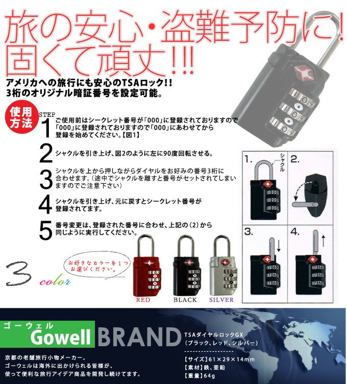 TSAロックで旅の安心と安全予防を! TSAロダイヤルロックGX 仕様 【サイズ】TSAダイヤルロックGX:61×29×14mm 【重 さ】64g 【材 質】 ・TSAダイヤルロック:鉄、亜鉛/台湾製 カラー TSAダイヤルロック(レッド、ブラック、シルバー) ご注意の注意 (1)登録された番号やカギは忘れたり紛失しないでください。