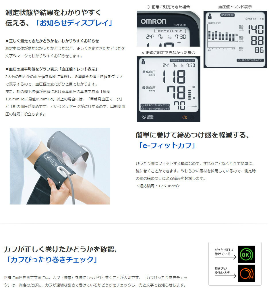 OMRON HEM-7511T オムロン 血圧計 上腕式血圧計 【製品仕様】 品番 オムロン 上腕式血圧計 HEM-7500シリーズ (型式:HEM-7511T) [HEM7511T] 本体寸法 幅124×高さ90×奥行き161mm 本体重量 約480g (電池含まず) 電源 / 単3形アルカリ乾電池×4(別売)、専用ACアダプタ(付属) 医療機器認証番号 226AABZX00163000 測定可能上腕周囲 約17〜36cm 付属品 腕帯(e-フィットカフ)、専用ACアダプタ、収納ソフトケース、取扱説明書(品質保証書付き)、医療機器添付文書、EMC技術資料 特徴 測定状態や結果をわかりやすくお知らせ。